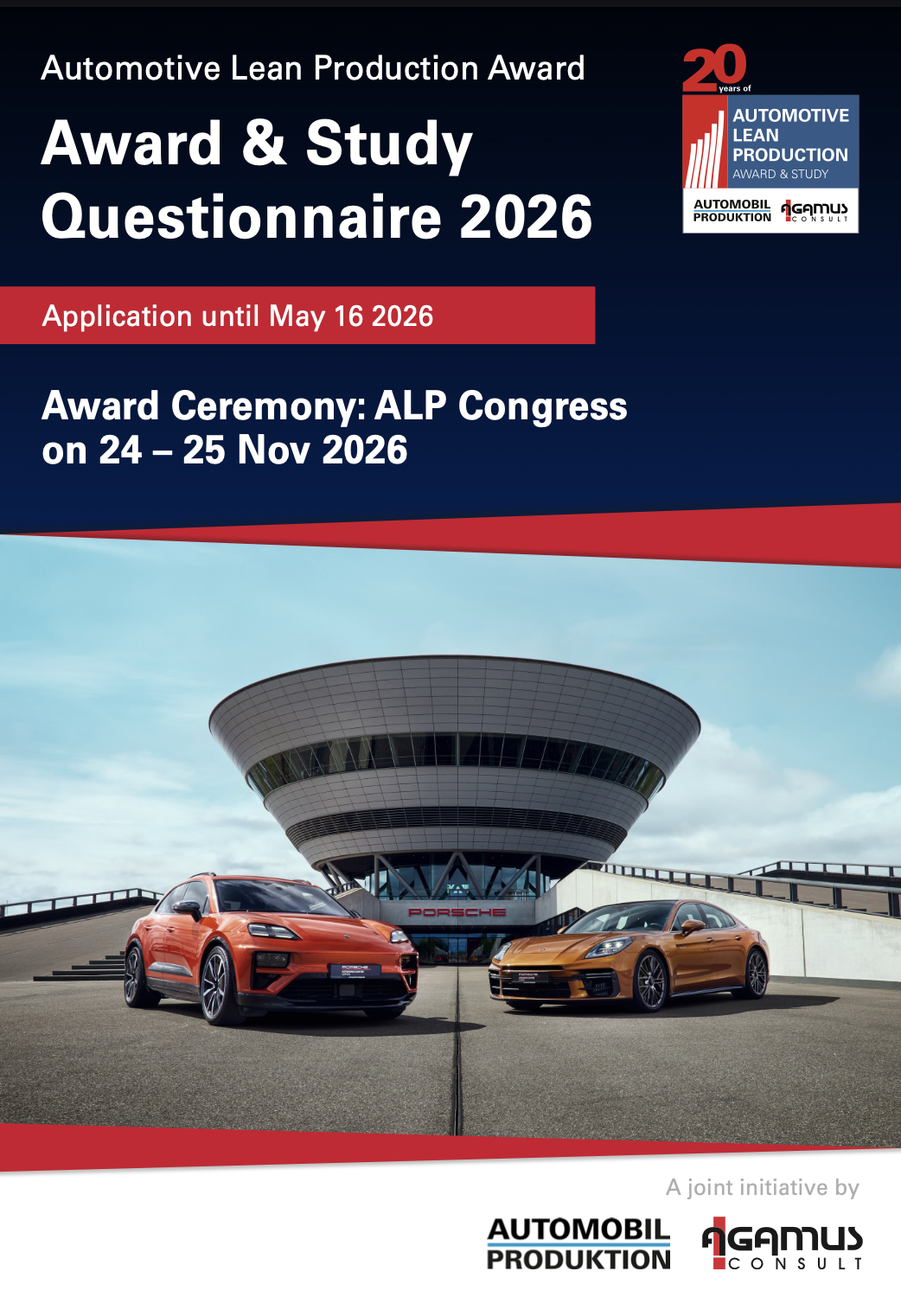 The application takes place with the submission of the questionnaire. For the Automotive Lean Production Awards 2026 the application period expires with the deadline for the study questionnaire on 16 May 2026.